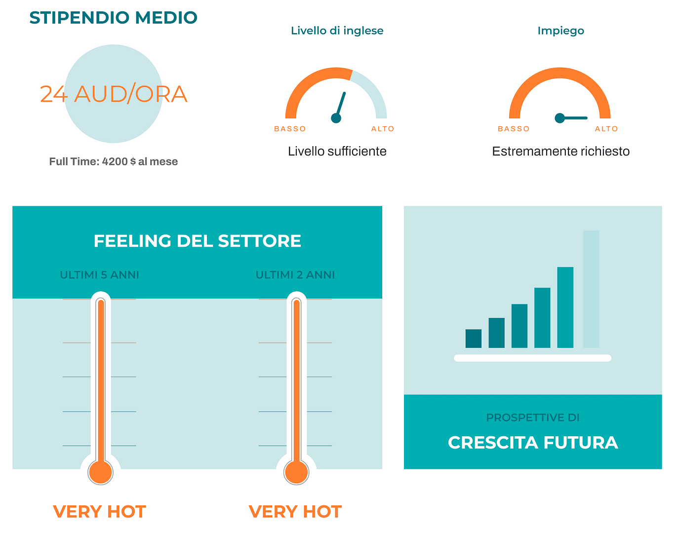 Secondo gli australiani il posto di lavoro ideale per un italiano è la cucina. In questo caso ti troverai, sì, a lottare con padelle e strani condimenti, ma farai parte di un team internazionale in cui avrai la possibilità di crescere e fare parecchia esperienza.